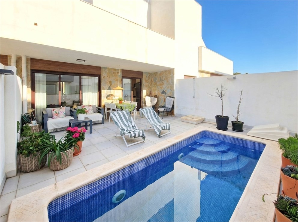 En la agradable zona de Lomas de Cabo Roig encontramos esta hermosa propiedad con un amplio jardín y piscina privada para refrescarte en los dias mas calurosos. Un interior moderno con tres dormitorios y dos baños, varias terrazas y un soleado Solarium. Garage incluido. Se vende completamente amueblada, incluyendo la barbacoa, los muebles de exterior y del interior. Excelente ubicación en una zona muy cerca de bares, restaurantes y supermercados. A solo 5 minutos en coche de las hermosas playa...
