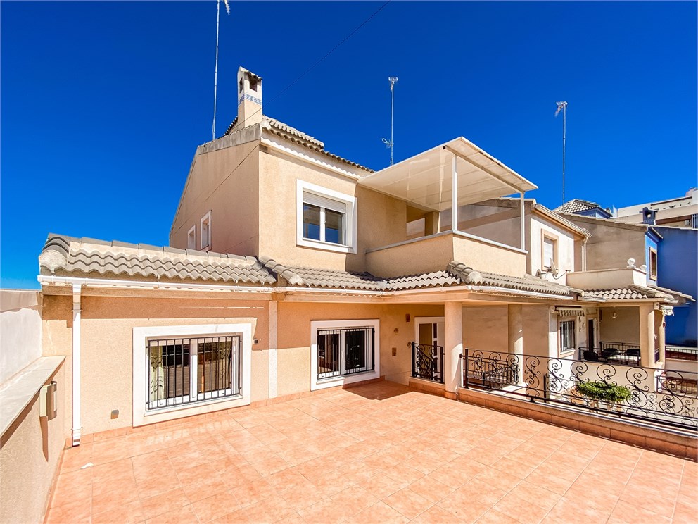 Fristående villa i tre plan i Formentera del Segura på en tomt om 449 m² med söderläge. Bostaden har 4 sovrum, 3 badrum och walk-in closet. Stort separat veranda med matplats, grill och badrum – perfekt för umgänge. Källare med stort garage och rymligt förråd. Ljust och bekvämt boende i lugnt område.