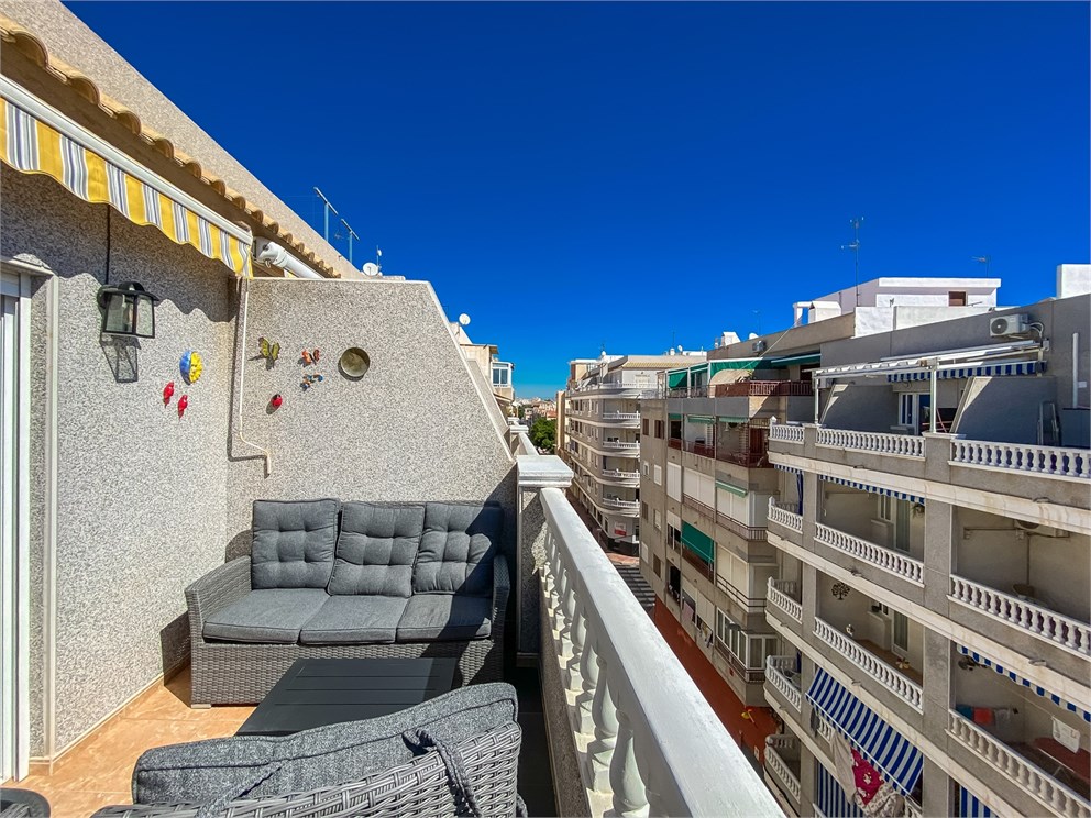 Välkommen till ett hem där stadspuls möter havshorisont. Vi presenterar nu en välplanerad lägenhet på högsta våning i centrala Torrevieja, endast sex minuters promenad från Playa del Cura. Bostaden erbjuder tre sovrum, två badrum och ett ljust vardagsrum med utgång till balkong. Här bor du med butiker och restauranger runt hörnet. Till lägenheten hör en privat garageplats i huset, vilket ger smidig komfort i vardagen. Ett perfekt boende för dig som söker närhet till både strand och stadsliv!