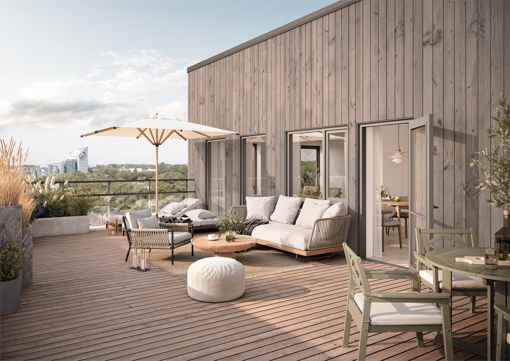 Generösa ytor och stora fönster gör dessa fyrarumslägenheter till perfekta familjehem. Här finns gott om plats för både sociala aktiviteter och lugna stunder, med rymliga sovrum och öppet funktionellt kök. Den stora terrassen på 39 kvadratmeter fungerar som en naturlig förlängning av vardagsrummet, en perfekt plats för att njuta av soliga dagar och kvällar i en bekväm och trivsam miljö. Här har man grönskan från parken precis utanför. I Brf Tilia står cykeln i fokus. Här bor man mitt i grönska...