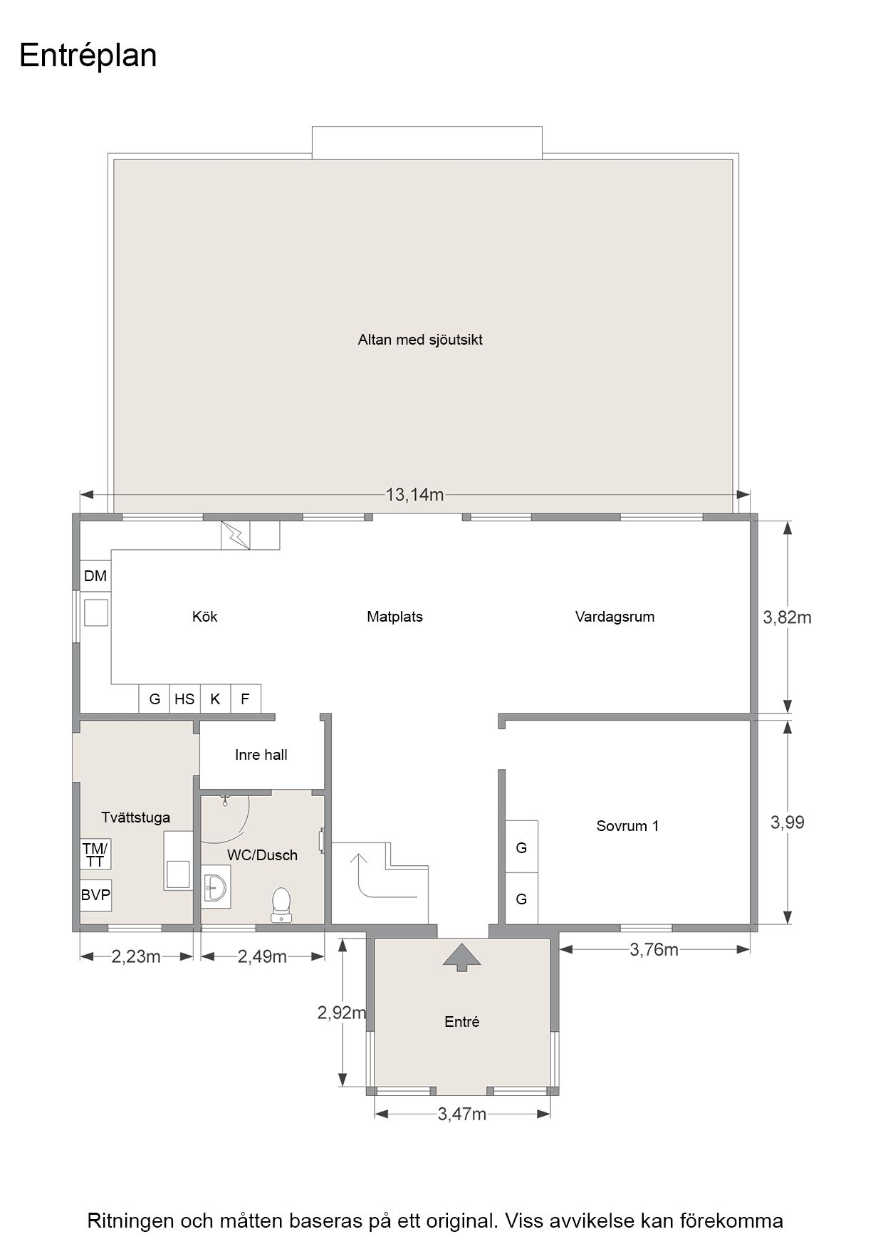 Rymlig entréhall, inre hall, sovrum 1, rymligt och praktiskt kök med rymlig, ljus och trevlig matplats med utgång till stor altan samt en underbar sjöutsikt över sjön Vänern, vardagsrum, inre hall, fräscht duschrum med duschhörna med vikväggar, wc och tvättställ, tvättavdelning med grovingång och bergvärmepump.