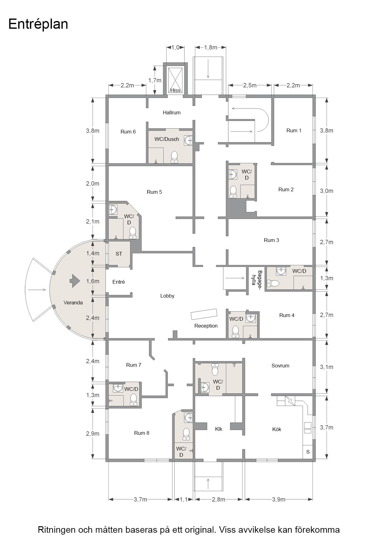 Välkomnande entré under tak i trevlig veranda, lobby med reception och kapprum. De 7 rummen, ligger på entréplanet: Rummen är olika till form, färg och storlek. Ett av de större rummen kan användas som familjerum. Hall med hiss till markplan och övre plan samt "personaltrappa" till övre plan och källarplan. Privat lägenhet om ett rum och kök hall med egen ingång och dusch/WC.