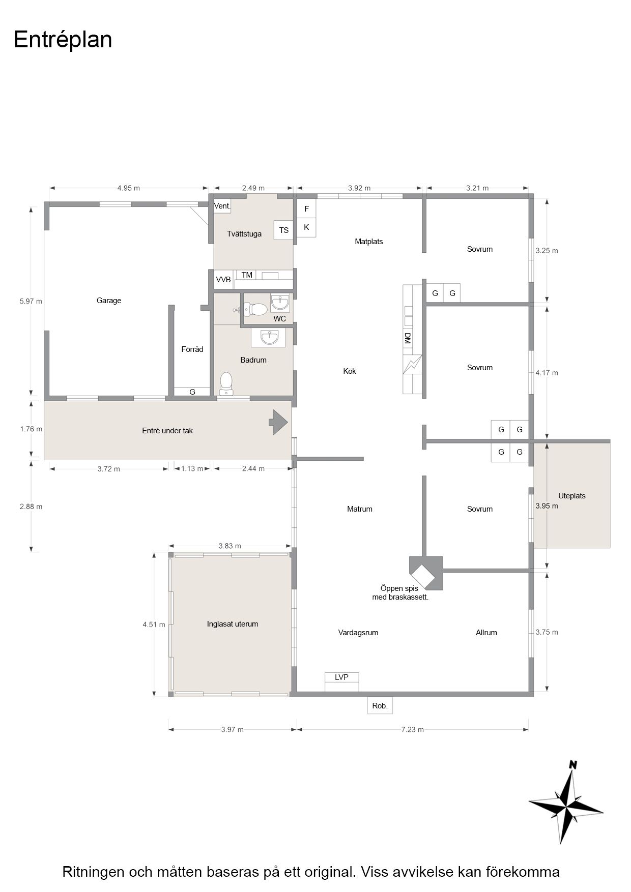 Entré under tak, entréhall, stort duschrum med wc och tvättställ, sep wc med tvättställ, stort praktiskt kök med rymlig matplats, sovrum/kontor med två garderober, stort sovrum med två garderober, sovrum med två garderober och utgång till uteplats, stort vardagsrum med luftvärmepump och öppen spis samt matrum och allrum i vinkel, praktisk tvättstuga med grovingång, stort garage med förråd.